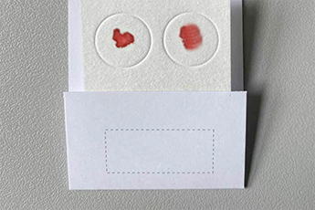 2、取2滴黄豆大小的血置于采集卡(纱布、干净卫生纸)上 3、将带有血痕的采集卡自然阴干(切忌用嘴吹或吹风机吹干)