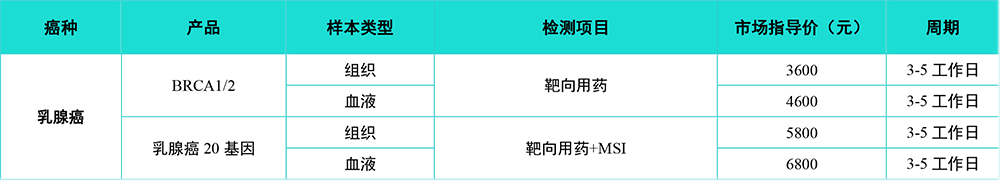 乳腺癌基因检测包含BRCA1/2和乳腺癌20基因检测,检测项目为靶向用药和靶向用药+MSI